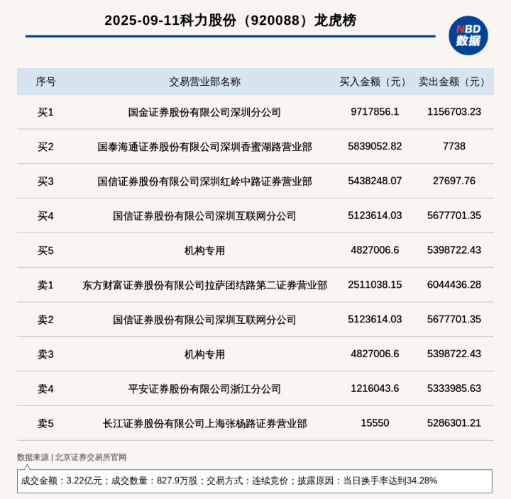 每经讯,2025年9月11日,北交所上市公司科力股份(920088,收盘价:39.29元)登上龙虎榜,交易方式是连续竞价,披露原因是当日换手率达到34.28%,成交数量827.9万股,成交金额3.22亿元。买一席位为国金证券股份有限公司深圳分公司,买入971.79万元;卖一席位为东方财富证券股份有限公司拉萨团结路第二证券营业部,卖出604.44万元。